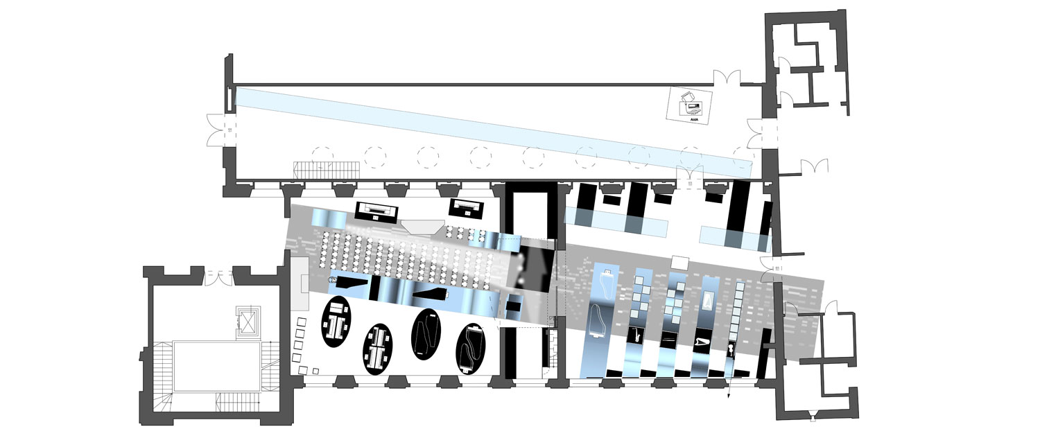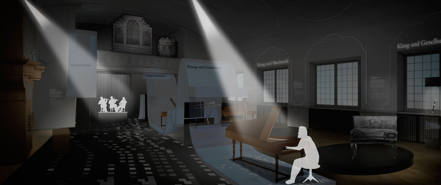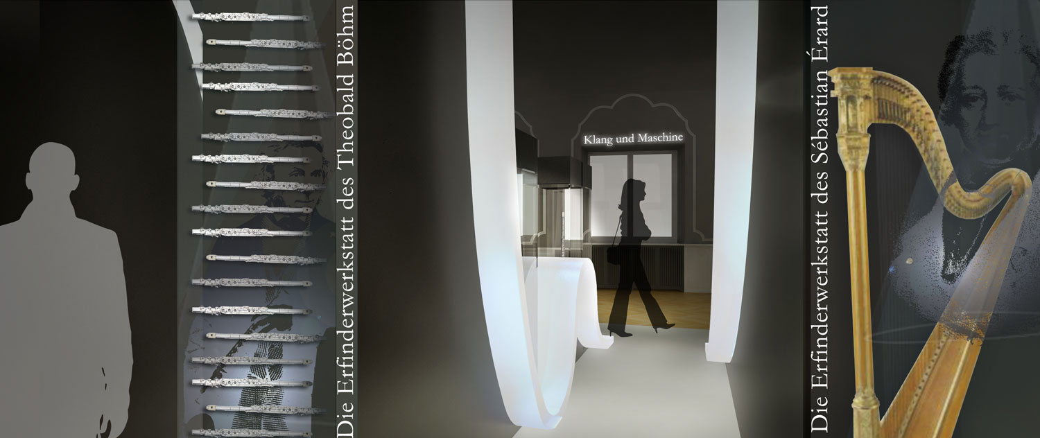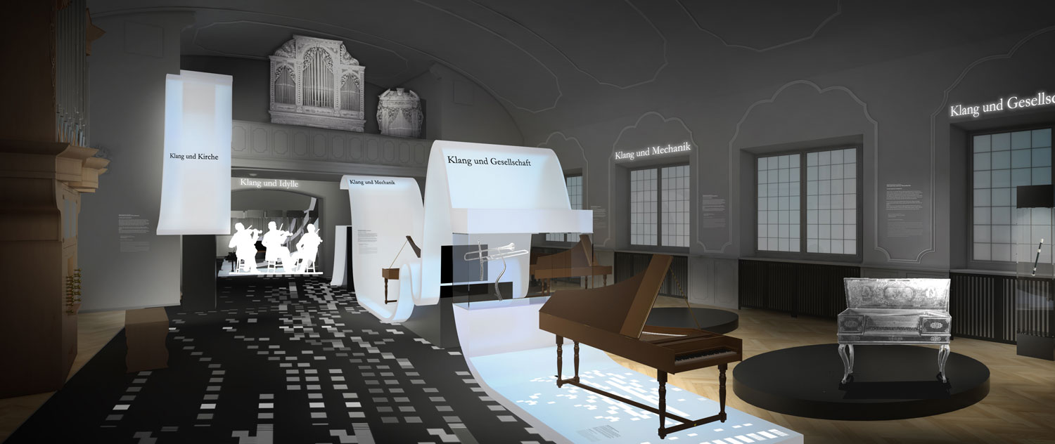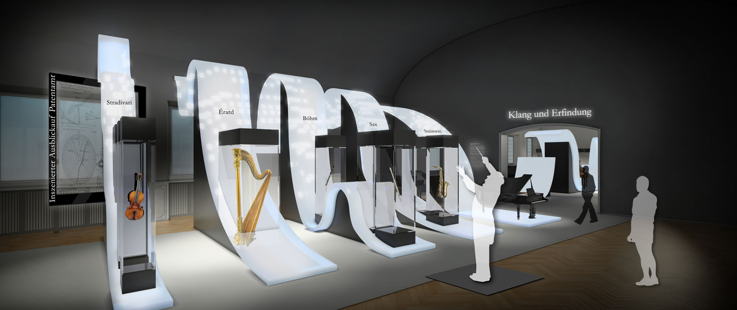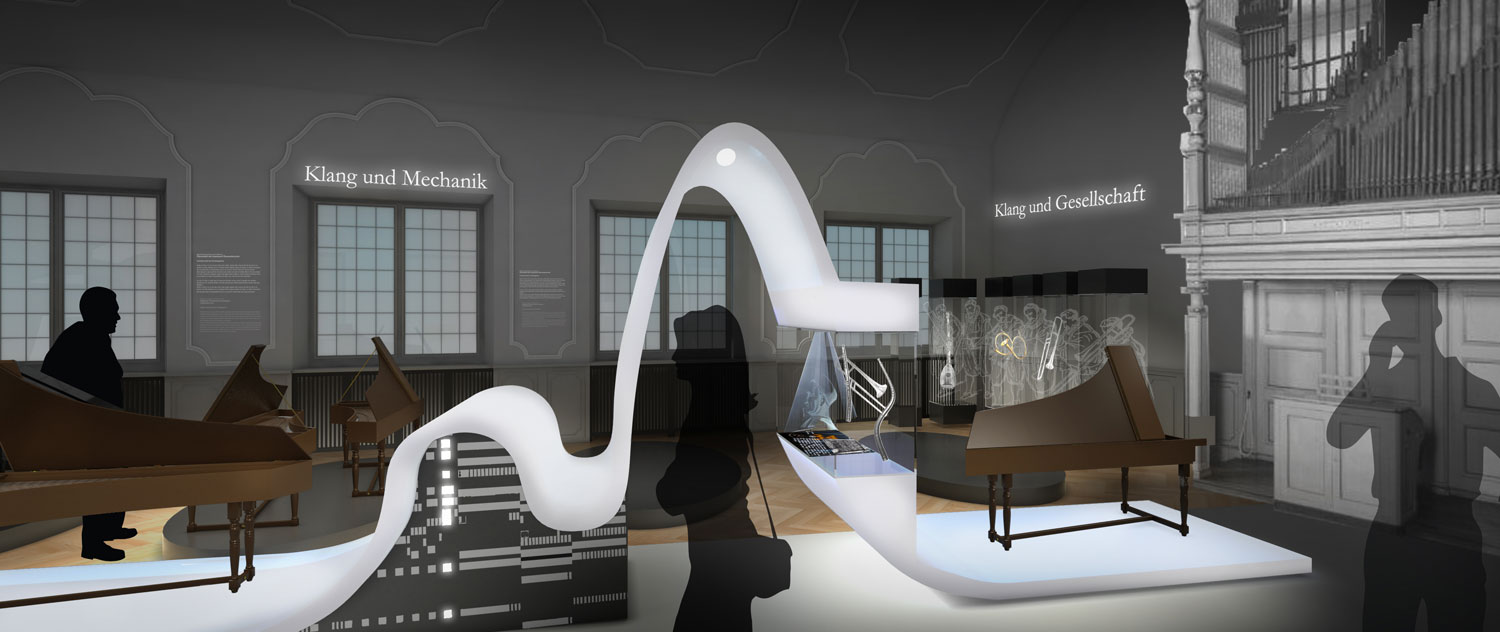 Das zweite, nicht realisierte Lieblingswerk unseres Ateliers. Inspiriert von Frequenzwellen, Schallwellen, Hüllkurven und Ernst Florens Friedrich Chladni wird die Ausstellung bestimmt von einzelnen im Raum “schwebenden”Wellen. Sie geben den Instrumenten und Ihren Themen einen Zusammenhalt. In der Form ausgeführt nach ihrem tatsächlichen Klang sind sie ein mathematischer und technischer Bestandteil der Ausstellung. Sie tragen die Leitobjekte mit ihrem Begleitexponaten und Vertiefungsebenen. Die weiteren Objekte jedes Moduls gruppieren sich jeweils darum. Vitrinen und Druchgänge unterbrechen die Längsachse der zentralen Welle in Saal A. Ebenso beinhaltet sie mediale Einheiten und kann eventuell sogar mit einem Bewegungssenor den Besucher eine Patitur steuern lassen. Der historisierende Raum bleibt somit unangetastet,er wird aber in seiner Farbigkeit dunkler werden, um den Exponaten mehr Strahlkraft verleihen zu können. Leichte Vitrinen (Ganzglas) behindern keine Blicke und lassen dem Raum eine Leichtigkeit spüren, trotz der Vielzahl an Objekten.