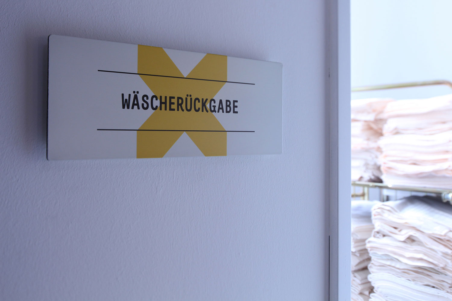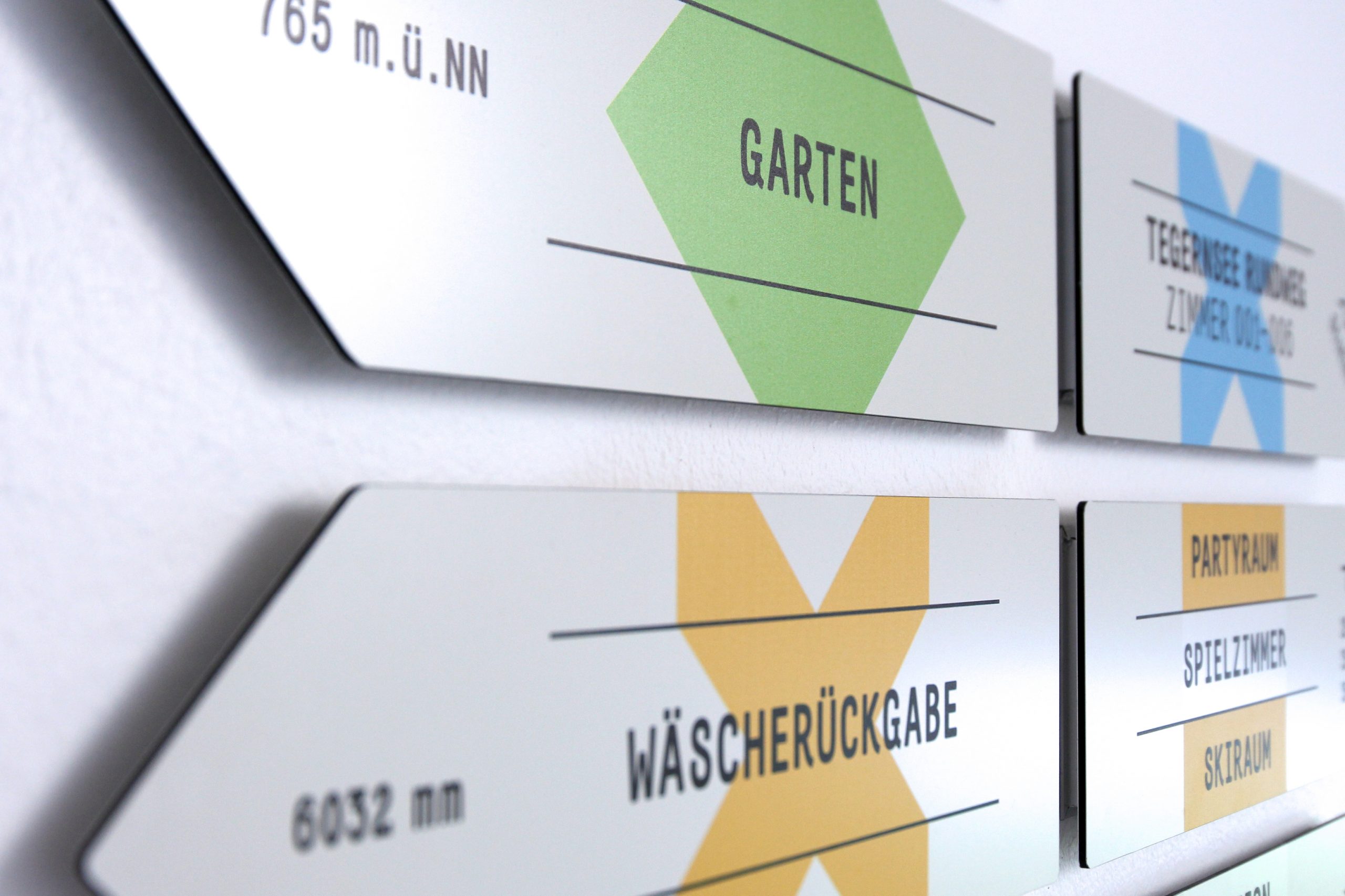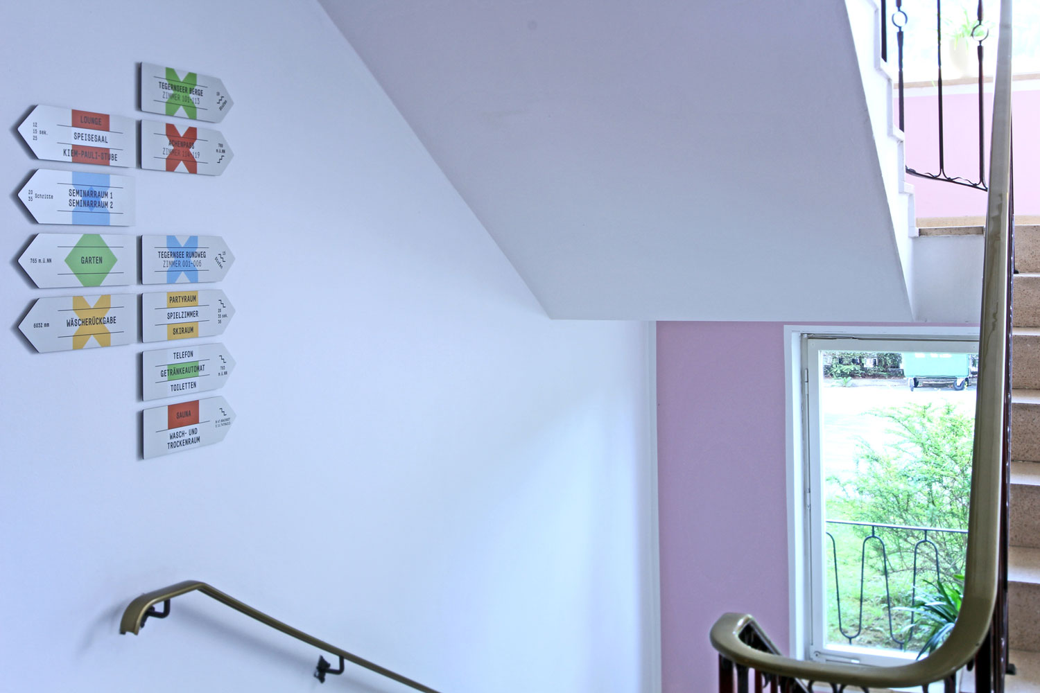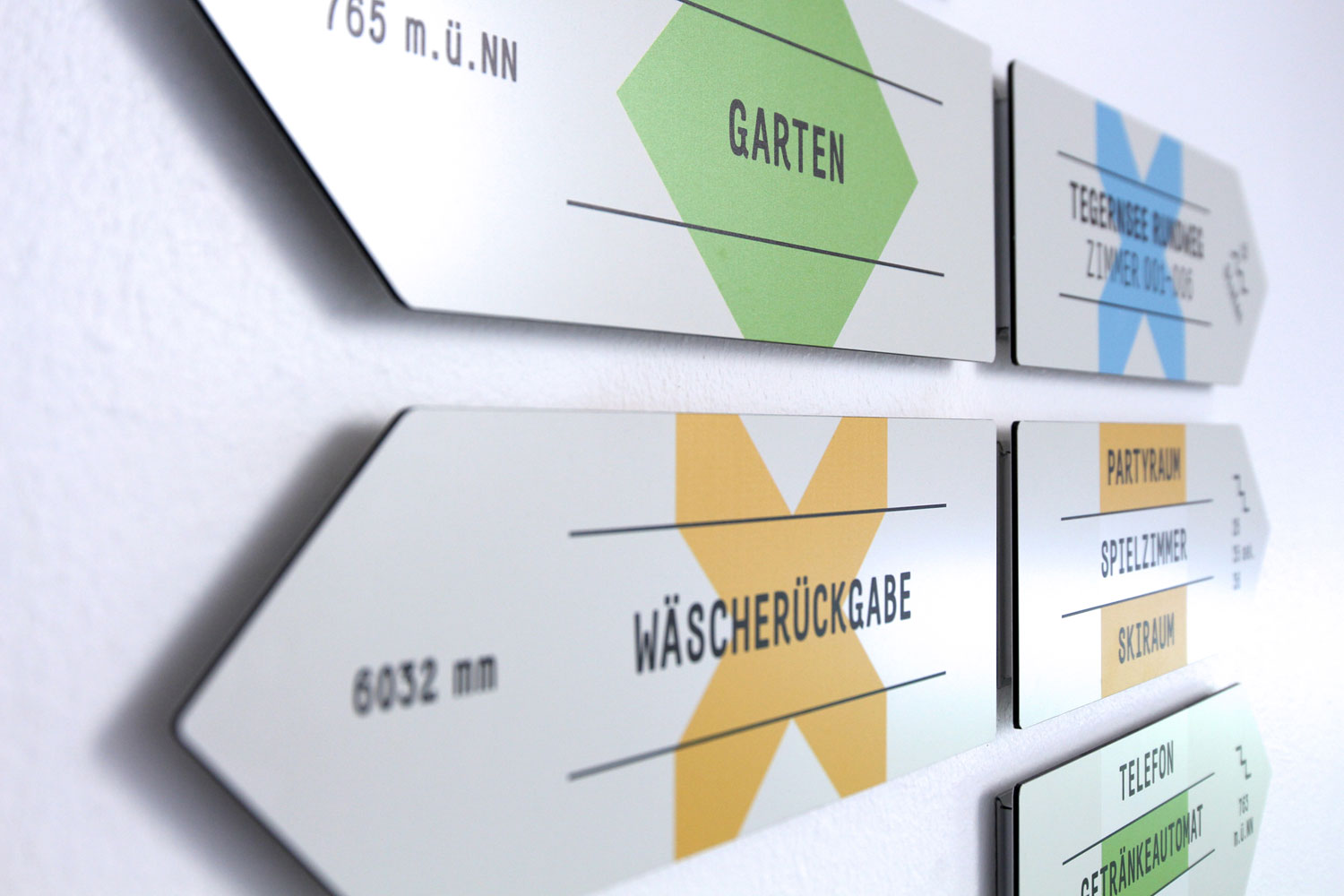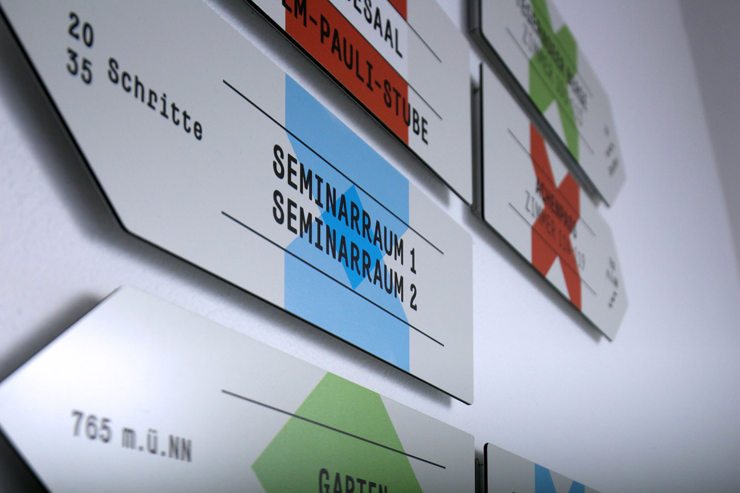 Das ebenfalls neu entwickelte Wegeleitsystem basiert auf traditionellen Wanderschildern und den Wegzeichen und Wegmarkierungen mit farbigen Grundformen als Orientierungszeichen. Zusätzliche Angaben zur Höhe, Geokoordinaten, Schrittzahlen, Entfernungen in Millimetern, etc. machen das Wegeleitsystem zu einer unterhaltsamen Wanderung durch das neu gestaltete Haus.