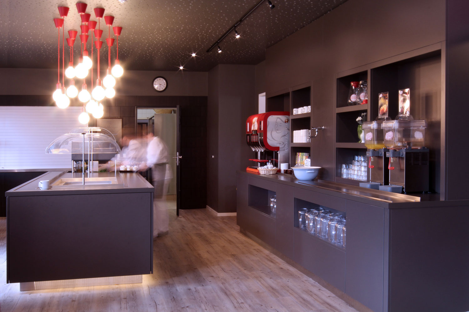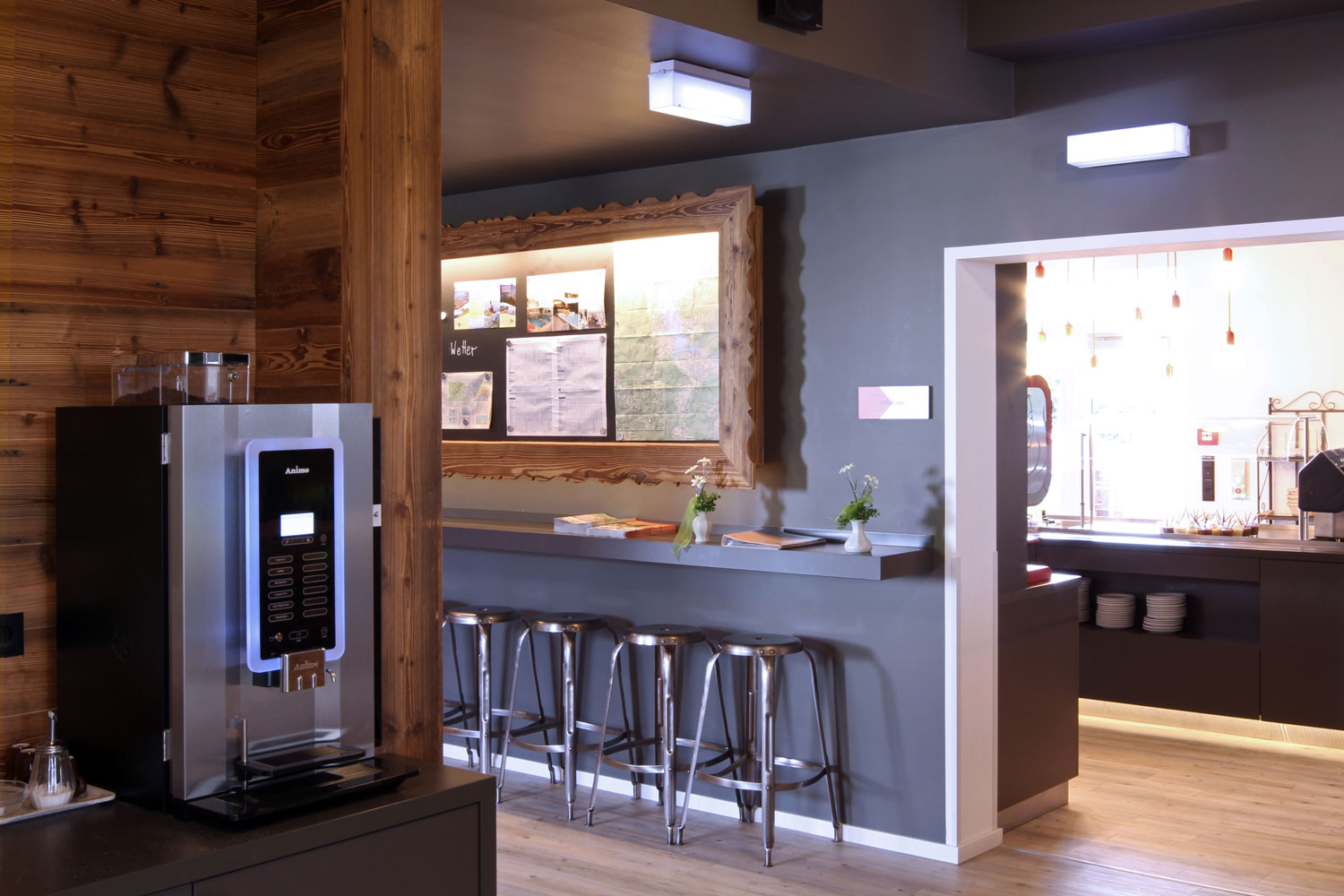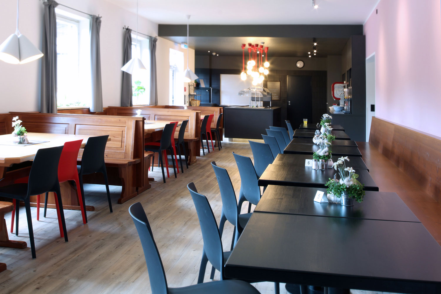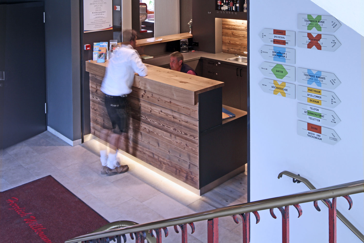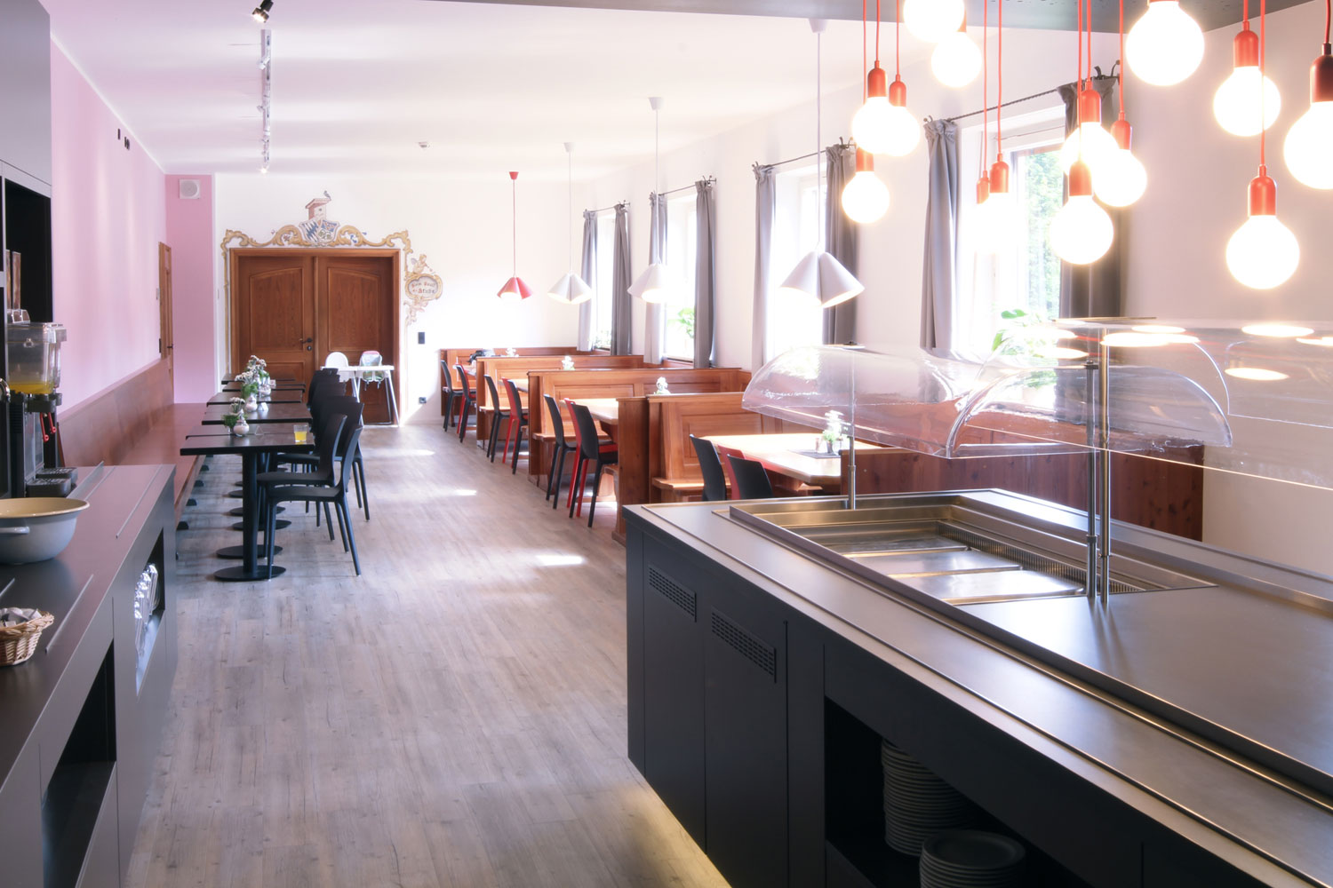 Mit der Sanierung und Modernisierung der öffentlichen Gästebereiche in der Jugendherberge Kreuth sollte die Rezeption zu einer zentralen Bar im Eingangsbereich erweitert werden. Gleichzeitig sollten die Lounge, der Empfangsbereich sowie der Speise und Seminarbereich erneuert werden. Im Zuge der Arbeiten wurden Durchbrüche zwischen Lounge und Speisesaal hergestellt. Ferner musste der Fluchtweg aus den Obergeschossen brandschutztechnisch gesichert werden.