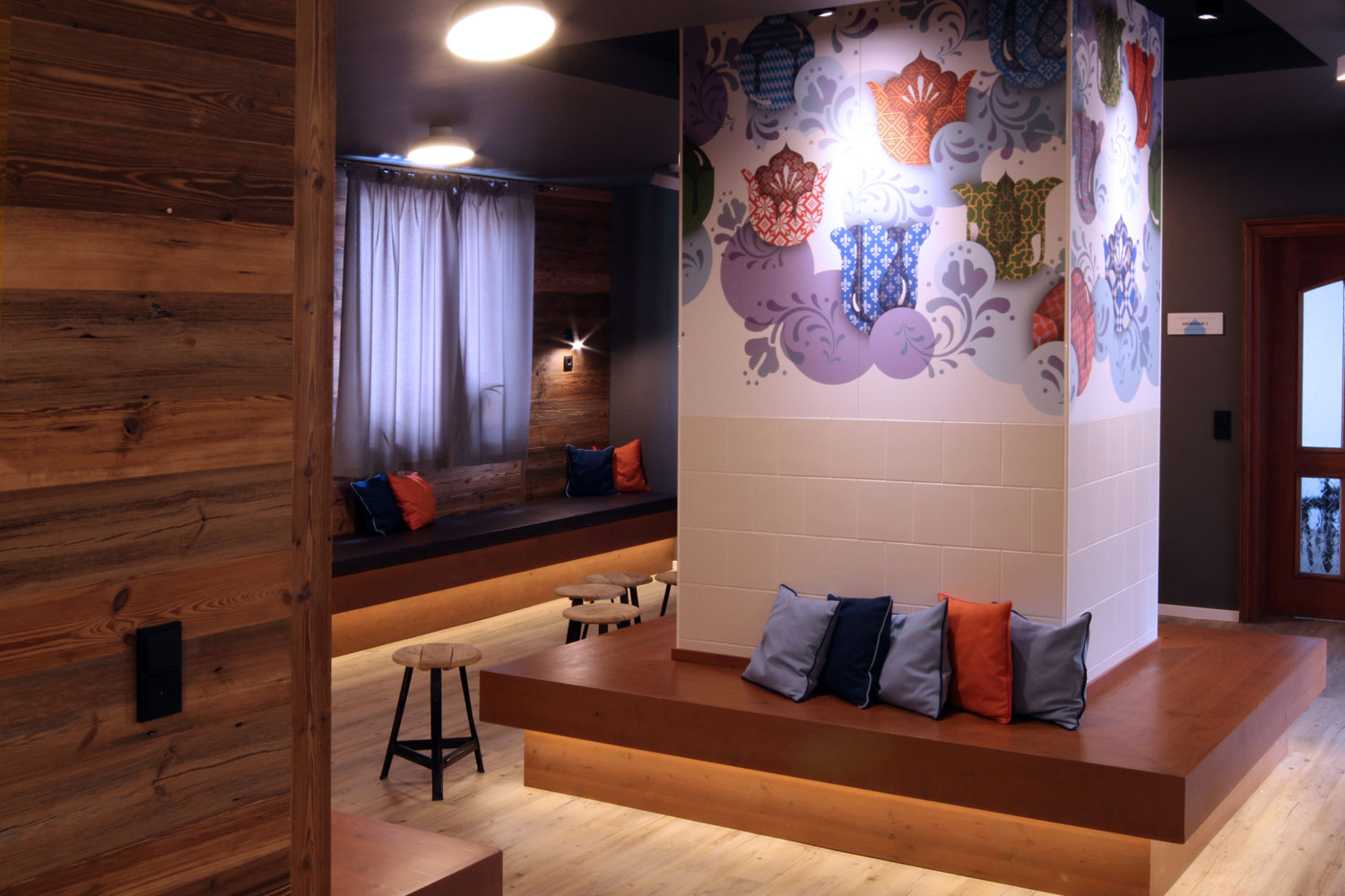 Die Lounge und der Bereich der Speiseausgabe wurden bewusst dunkel gestaltet und wechseln sich mit den hellen freundlichen und farbigen Bereichen beim Empfang, im Speisesaal und in der Kiem-Pauli-Stube ab. Weitere alpine Motive wie rote Bergseile wurden für Leuchtenkabel und als Zeitungselement eingesetzt. Die Jugendherberge wurde ursprünglich zu Ehren des Volkssängers und Liedersammlers Kiem Pauli 1962 errichtet. In der traditionellen Kiem-Pauli-Stube wurden historische Fotografien und Ölgemälde des Volkssängers gesammelt und inszeniert.