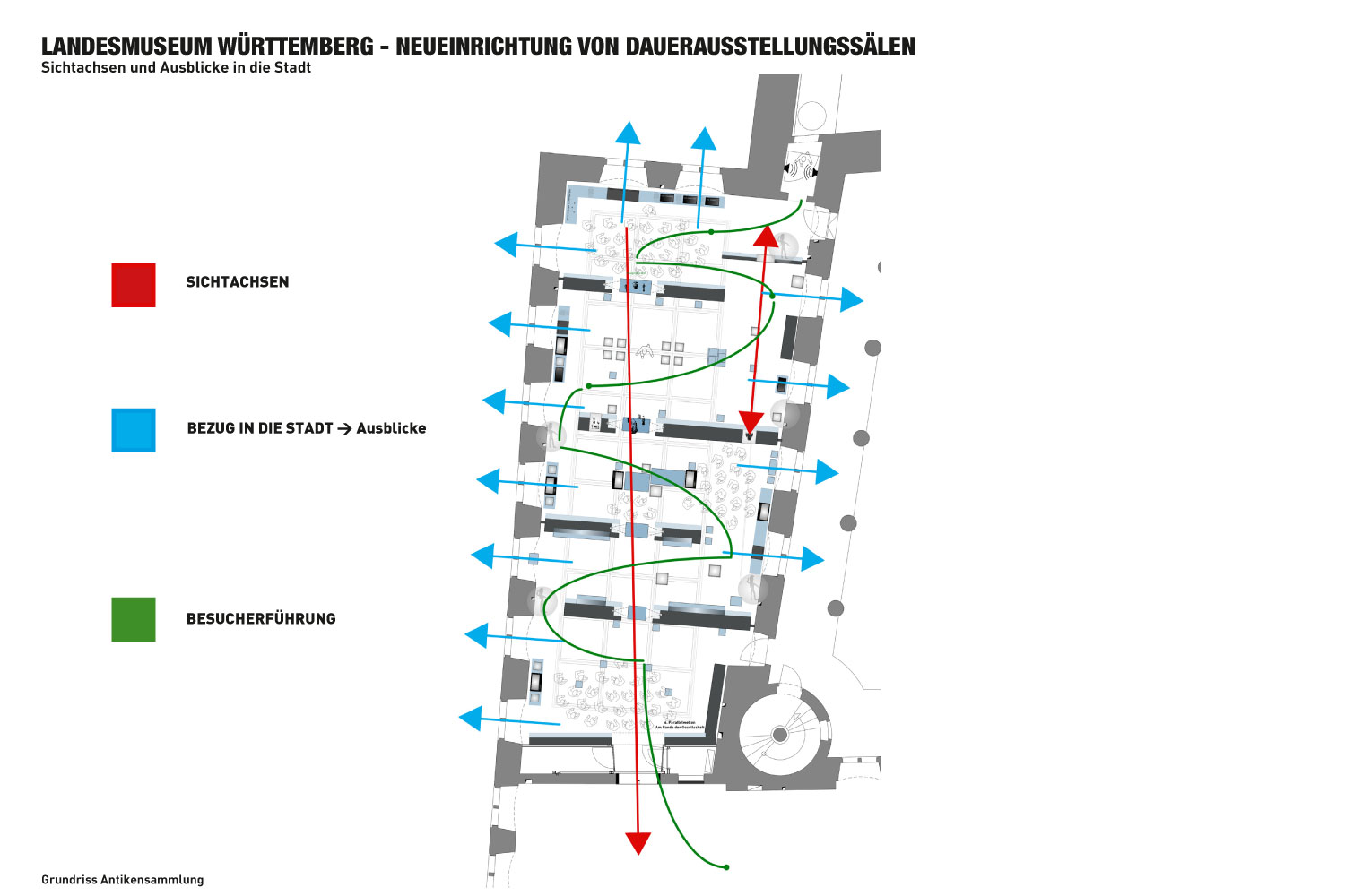 Durchgängiges Prinzip des Ausstellungsentwurfes sind Blickachsen, die dem Besucher einen Über- und Ausblick über die Gesamtthematik geben. Gleichzeitig werden die Besucher, die sich durch diese Achsen quer hindurchbewegen zu Protagonisten der gesamten Ausstellung. Wie in einem Theater werden den Besucher Plätze zum Verweilen und Betrachten geboten.