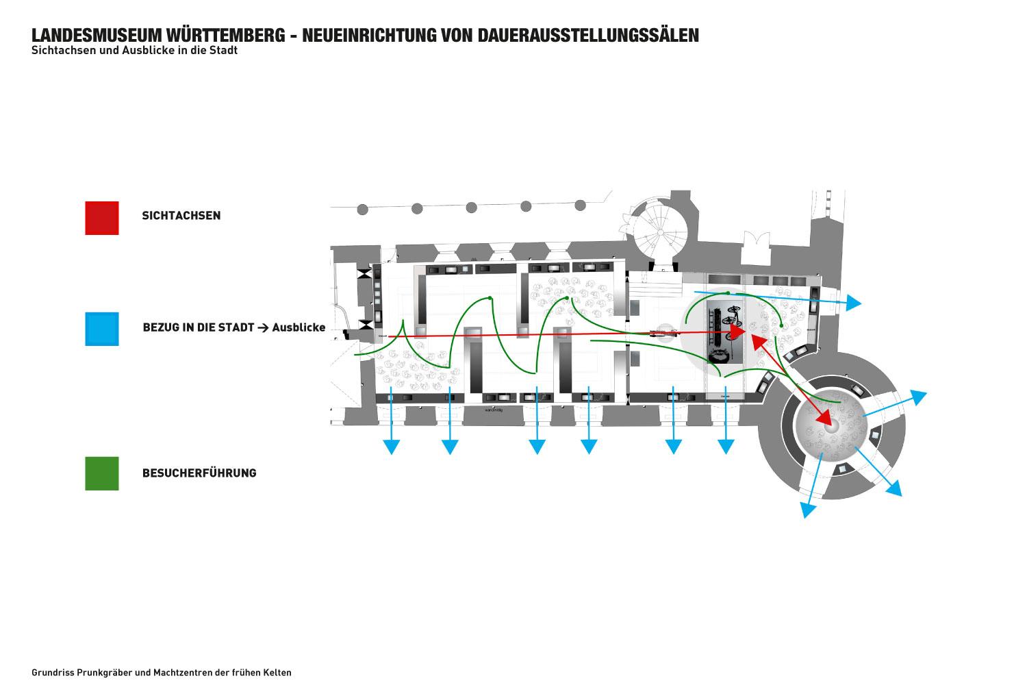 In jedem Feld bieten sich Querbezüge und Blicke zur Stadt. Abschließendes Highlight ist das Grab von Hochdorf, dass magisch unter dem Scheitelbogen eines keltischen Hügelgrabes präsentiert werden soll. Es befindet sich am Abschluss der Zentralperspektive des Keltenraumes.