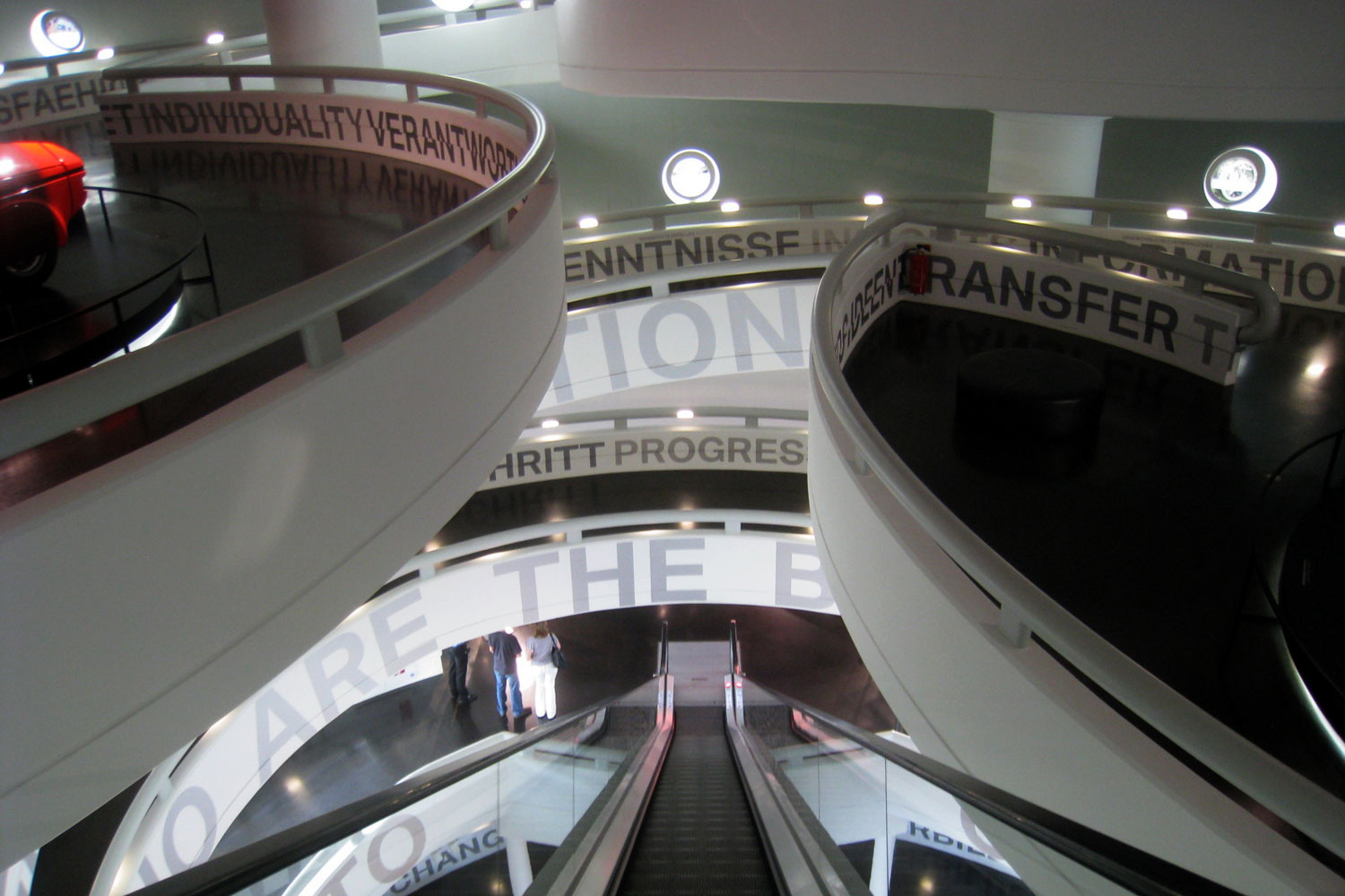 Die mit medialen Mitteln dramatisierte Ausstellungsarchitektur bildet den eindrucksvollen Rahmen für die Exponate. (Atelier Brückner) Im Mittelpunkt der Ausstellungsräume stehen 3-geschossige, interaktive LED-Wände, die unterschiedlich bespielt werden. Die Rotunde der berühmten BMW- Schüssel wird mit einer audiovisuellen Symphonie inszeniert. Atelier Hammerl wurde mit der Bauleitung des Museumsausbaus sowie den Exponatmontagen als Projektleitung beauftragt.