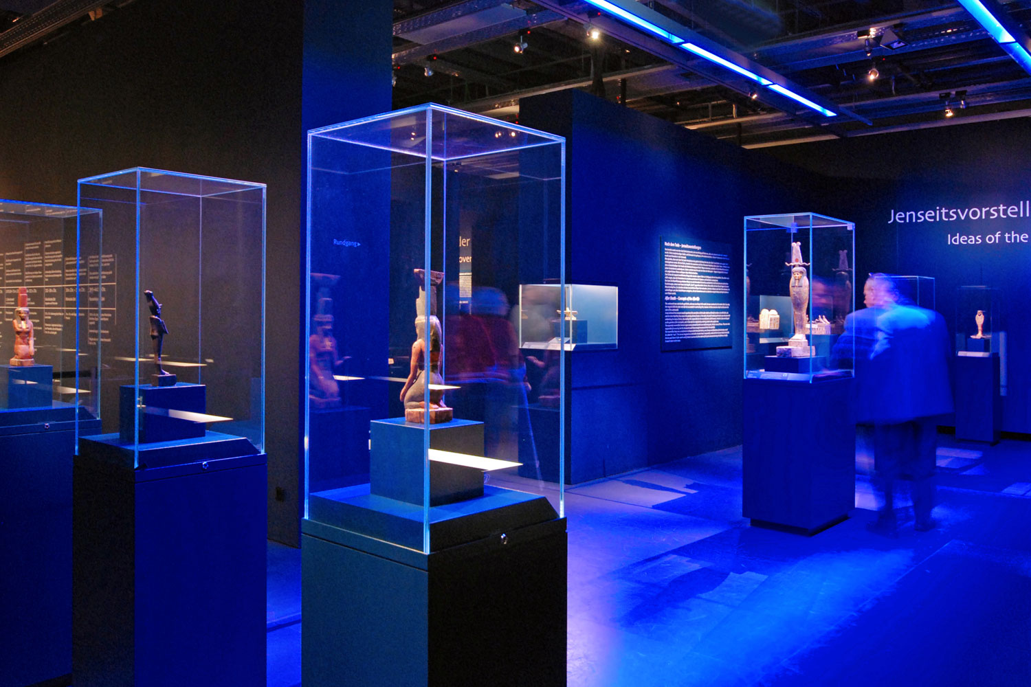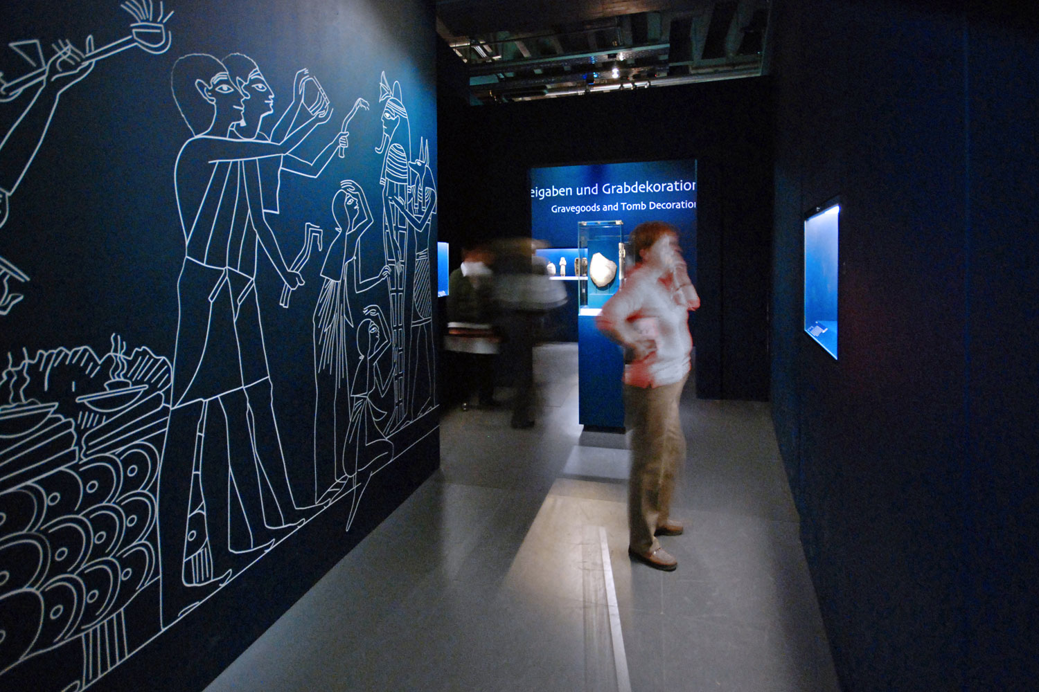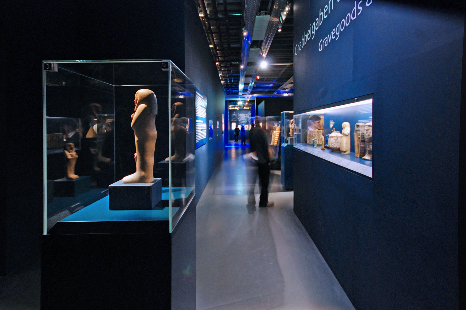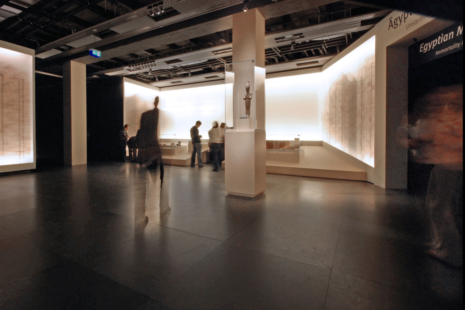 Der Ausstellungsrundgang beginnt für den Besucher schon im Erdgeschoss. Hier gibt es eine eigene Kinderausstellung zum Thema und eine kleine zusätzlich konzipierte Ausstellung für das Warteschlangenmanagement. Das Treppenhaus ist als Grafikausstellung gestaltet und stimmt den Besucher inhaltlich und atmosphärisch ein. Ist der Besucher im 3. Obergeschoss angekommen, taucht er unmittelbar in die Welt Ägyptens ein. Er befindet sich in der Wüste Ägyptens, umgeben von altägyptischer Architektur eines bedeutenden Grabkomplexes, die des König Djoser in Saqqara. Die Architektur zeigt die Umfriedungsmauer des Komplexes. Die Auftaktinszenierung wird durch eine spezielle Lichtstimmung unterstrichen. Das Gefühl von Weite und gleißender Sonne wird spürbar.