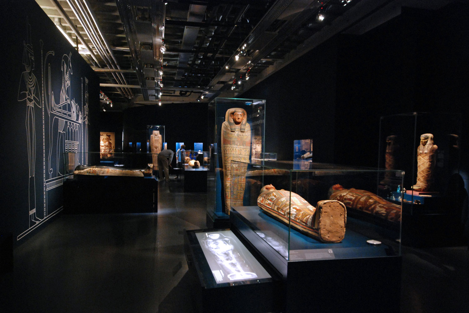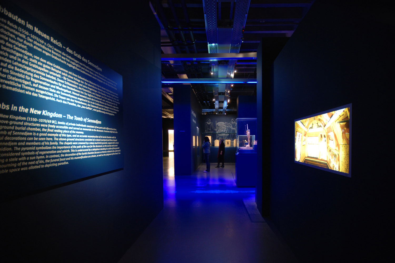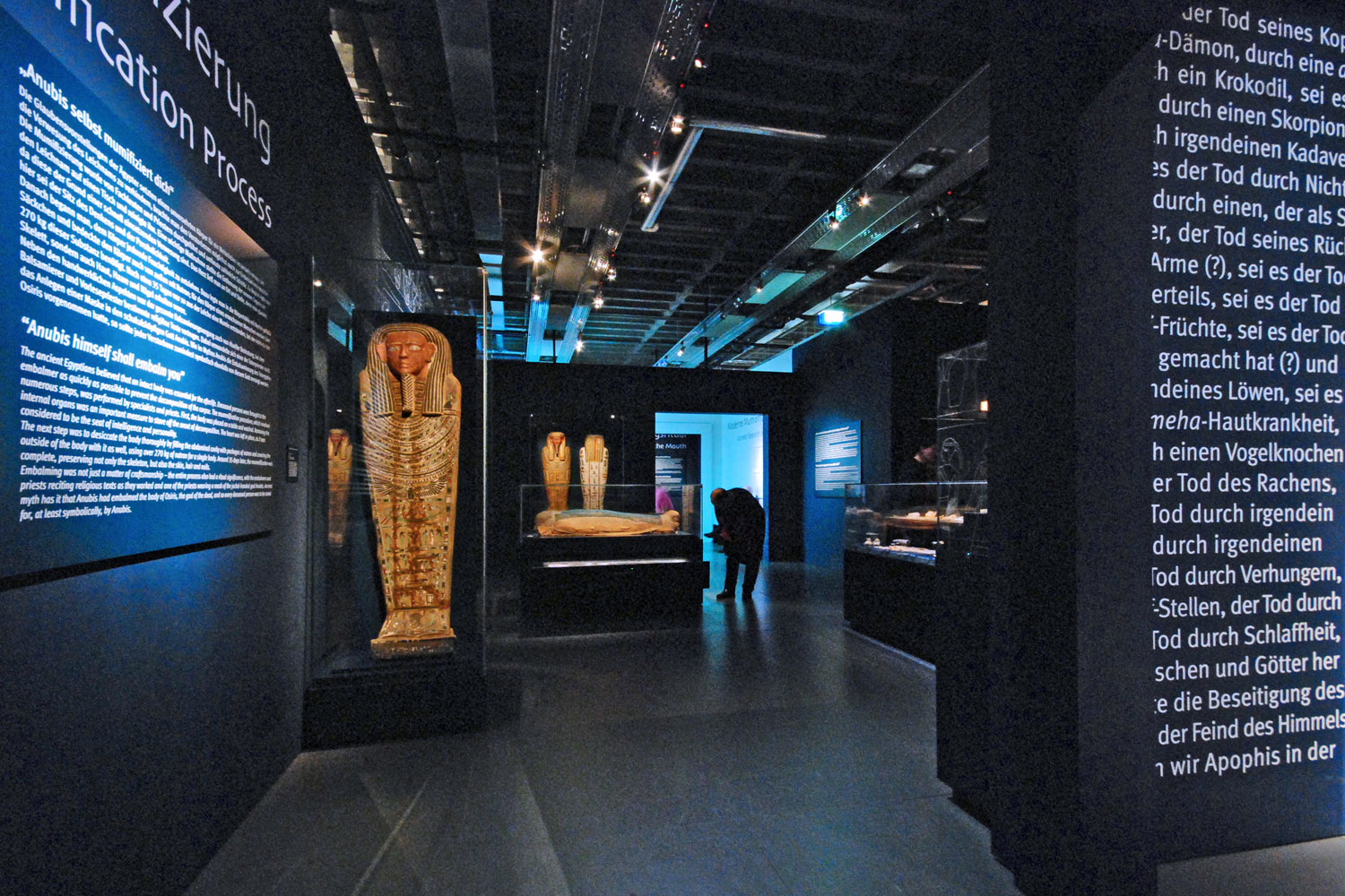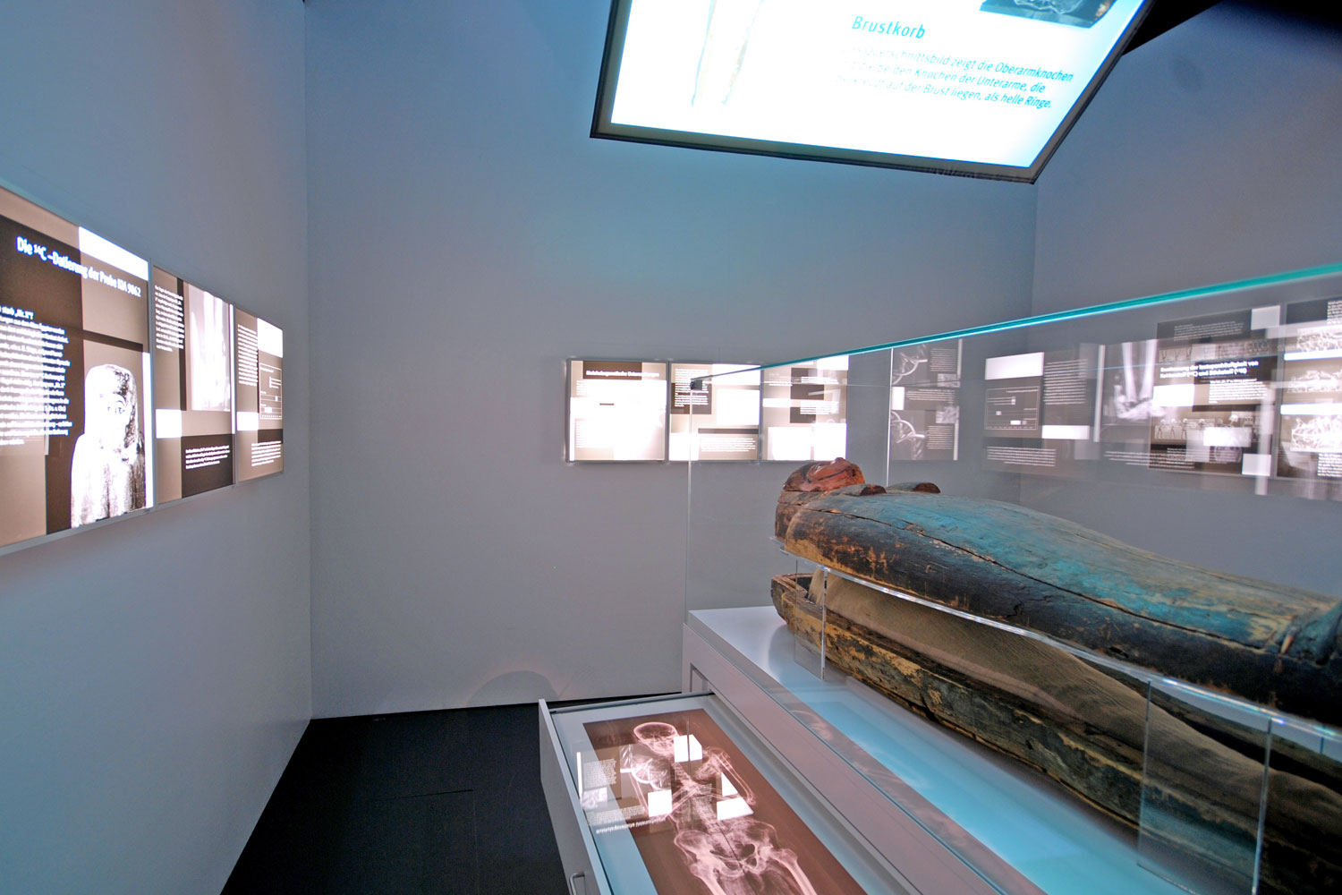 Das Ausstellungskonzept sieht drei übergeordnete Bereiche vor. Hinsichtlich einer architektonischen Inszenierung soll der Besucher langsam zu den Mumien hingeführt werden. Dies geschieht über drei Ebenen ägyptischer Grabarchitektur. Durch die Außenmauer eines Grabkomplexes gelangt er in einen Zwischengang, wie er auch in der Gräbern zu finden ist. Den Abschluss bildet die Grabkammer, in der die Mumien Ruhe finden. Die Ausstellungsarchitektur definiert sich durch die Zurückhaltung, der komplett einfarbigen Präsentation in Blau. Überdimensionale ägyptische Strichgrafiken betonen einzelne Bereiche. Ein Hauptaspekt liegt in der Lichtstimmung. Im Verlauf des Rundganges verdunkelt sich die Raumatmosphäre von Abschnitt zu Abschnitt. Sie schafft eine gedämpfte Raumstimmung, die für eine würdevolle Präsentation der Mumien wichtig ist.