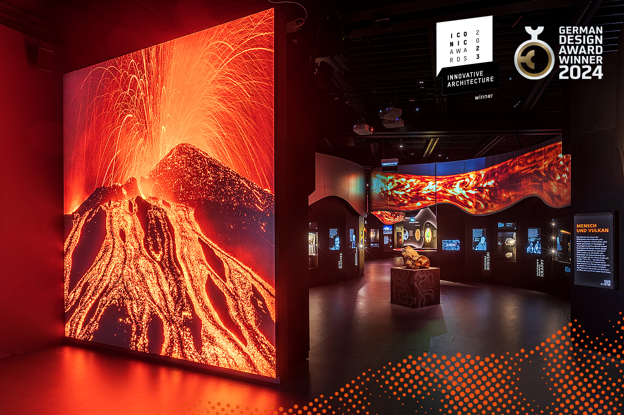 Atelier Hammerl & Dannenberg inszeniert die Welt der Feuerberge auf 1500qm. Vulkane weltweit werden betrachtet, Forscher berichten über die neuesten Erkenntnisse, es steht aber auch das Leben jener 10% der Weltbevölkerung im Fokus, die in direkter Nachbarschaft mit den Gefahren leben.